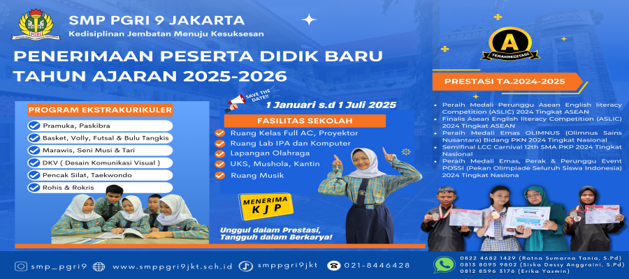 HITVBERITA.COM | SMP PGRI 9 Jakarta, merupakan salah satu sekolah swasta, yang bernaung dibawah Yayasan Pembina Lembaga Pendidikan (YPLP) Persatuan Guru Republi