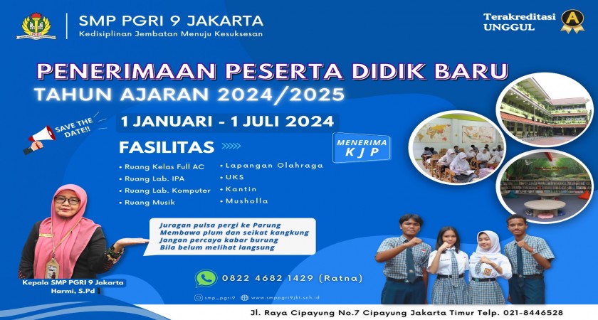 Kabar gembira bagi orang tua/wali siswa yang ingin menyekolahkan putra/putrinya ke tingkat SMP. SMP PGRI 9 Jakarta telah membuka pendaftaran Penerimaan Peserta Didik Baru Tahun Pelajaran 2024-2025, mulai dari 01 Januari 2024 s.d 1 Juli 2024. Ayoo.. segera daftarkan sebelum kuota penuh, untuk info lanjut bisa hub Ibu Ratna, S.Pd di No. 082246821429